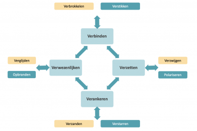 Polariseren: Waar verzet de boventoon krijgt in de interacties, ontstaat polarisatie. Gelijk halen, winnen of de ander overtuigen worden veel belangrijker dan de relaties in de groep of het resultaatgericht samenwerken. De sfeer wordt conflictueus en onveilig, en niet zelden ontstaan in de strijd vaste kampen met daartussen een zich uitdiepende kloof. De groep rijdt zich vast in conflict.