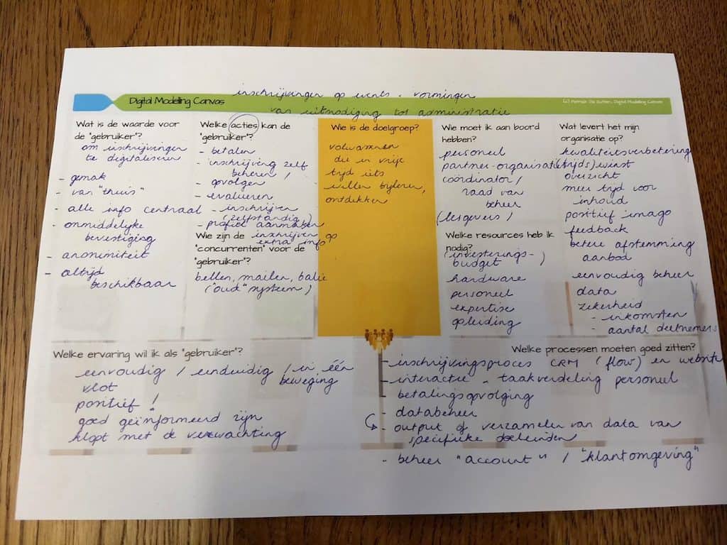 Tijdens de workshop werkten we met een variant op het bekende business model canvas van Osterwalder. Hiermee breng je je bedrijfsmodel in kaart of creëer je een nieuw model. Het digital modelling canvas bekijkt een praktijk of proces vanuit twee invalshoeken: de gebruiker en de organisatie. Het is een goed hulpmiddel om processen te analyseren en verbeteren, vertrekkend van de vraag hoe je jouw gebruiker of doelgroep een betere digitale ervaring kan bieden.