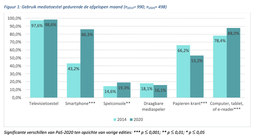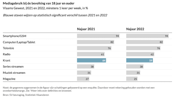 Tegenover de opkomst van de smartphone staat een daling in het gebruik van de meer traditionele media zoals de papieren krant. Vooral hoogopgeleiden en oudere leeftijdsgroepen lazen nog een papieren krant. Hoewel je de krant ondertussen ook digitaal kan lezen, daalde het aandeel Vlamingen dat in het najaar 2022 de krant las naar 59% tegenover 64% in het najaar 2021. Volgens het Digital News Report verliezen gedrukte pers, maar ook andere traditionele nieuwsmedia zoals televisie- en radionieuws, gebruikers; ook bij oudere leeftijdsgroepen en hoogopgeleiden. We richten ons meer en meer tot andere online nieuwsbronnen.