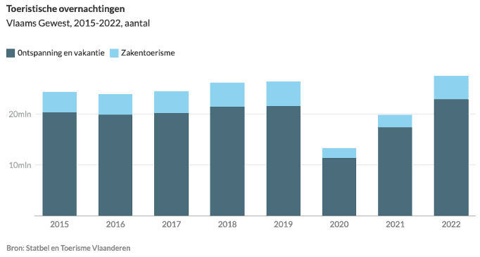 In 2022 werden in totaal 27,5 miljoen toeristische overnachtingen geboekt in het Vlaamse Gewest. Dat zijn er 39% meer dan in 2021, toen er nog covidmaatregelen golden. De zakentoeristen waren in 2022 goed voor 17% van de geboekte overnachtingen. De overige overnachtingen gebeurden in het kader van reizen als ontspanning en vakantie. Door het wegvallen van de covidmaatregelen kwamen er in 2022 vooral weer meer buitenlandse toeristen naar Vlaanderen, maar ook het aandeel binnenlandse overnachtingen nam licht toe met 8%.