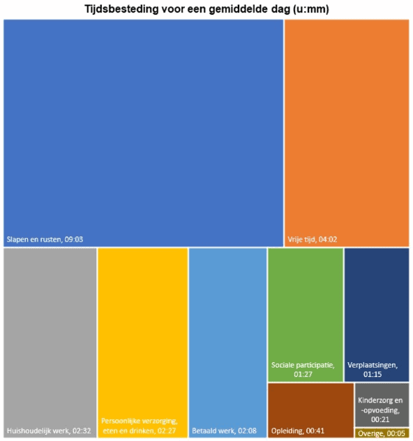 Het voelt wellicht anders aan, maar het aandeel vrije tijd is sterk toegenomen. In 2013 waren we vier uur per dag bezig met onder andere sport, hobby’s, tv kijken en scrollen op sociale media. Recentere cijfers op basis van tijdsbudgetonderzoek zijn (nog) niet beschikbaar. Slapen en rusten is de activiteit die het grootste deel van ons leven inneemt. Gemiddeld doen we dat iets meer dan 9 uur per dag of bijna 38% van onze tijd. Betaalde arbeid staat bij velen centraal in het leven. Toch werken we gemiddeld maar iets meer dan 2 uur per dag, nog geen 10% van de tijd. Uiteraard zijn er grote verschillen tussen individuen. Bovendien besteden we onze tijd tijdens een weekdag heel anders dan in het weekend.