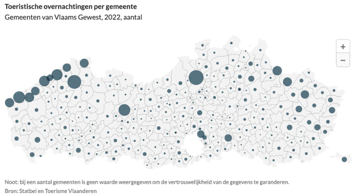 Belgen waren in 2022 goed voor bijna 16,4 miljoen overnachtingen of 60% van het totaal aantal overnachtingen in het Vlaamse Gewest. 31% van alle overnachtingen in het Vlaamse Gewest, ruim 8,5 miljoen overnachtingen, vond in 2022 plaats aan de kust. De 5 kunststeden (Antwerpen, Brugge, Gent, Leuven en Mechelen) waren samen goed voor ruim 6,6 miljoen overnachtingen of 24% van het totaal. De rest van de overnachtingen vond plaats in de andere Vlaamse gemeenten, met de grootste aantallen in enkele gemeenten in de Kempen (vakantieparken) en in Machelen (nabijheid luchthaven).