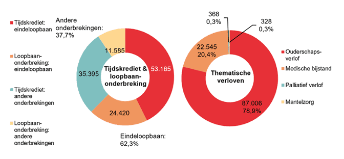 De meerderheid van de onderbrekingsuitkeringen was voor een vermindering van het werkregime met 1/5: 143.172 uitkeringen, 61,0% van alle uitkeringen voor 2020. Het aantal voltijdse onderbrekingen is vrij beperkt: 16.169 uitkeringen of 6,9% van de gevallen.