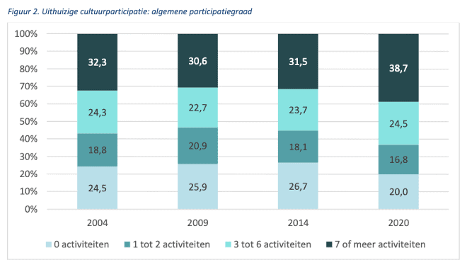 Volgens de metingen van de participatiesurvey in 2004, 2009 en 2020 nam ongeveer drie kwart van de bevolking deel aan minstens één culturele activiteit in de zes maanden vóór elke bevraging. In 2020 steeg dat tot 80%. Bovendien is ook de intensiteit van participatie toegenomen. In 2020 heeft 38,7% aan zeven of meer uithuizige culturele activiteiten deelgenomen; in de voorgaande metingen varieerde dat cijfer van 30,6% tot 32,3%.