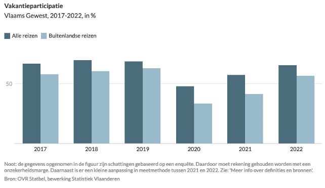 In 2022 maakte 65% van de inwoners in het Vlaamse Gewest minstens 1 reis met minstens 1 overnachting, 57% van de inwoners maakte minstens 1 buitenlandse reis. Door de covidpandemie lag de vakantieparticipatie in 2020 en 2021 veel lager dan in de voorgaande jaren. Van 2017 tot 2019 schommelde de algemene vakantieparticipatie rond 69% en steeg de buitenlandse vakantieparticipatie van 58% tot 63%. In 2022 steeg de vakantieparticipatie opnieuw en dat voor alle reizen, maar nog niet tot op het niveau van 2019.