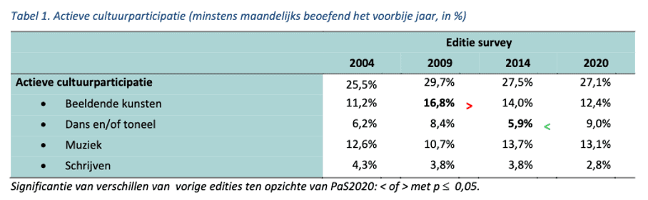De actieve deelname aan cultuur (amateurkunstbeoefening) bleef in 2020 (voor de covidpandemie) op hetzelfde niveau als bij de voorgaande edities. Net iets meer dan een kwart beoefende anno 2020 een creatieve hobby en oefende die minstens maandelijks uit.