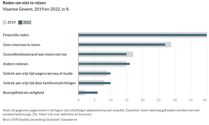 In 2022 gaf 40% van de inwoners van het Vlaamse Gewest aan dat ze niet gereisd hebben om financiële redenen. 27% had geen interesse in reizen en voor 15% was het niet mogelijk om te reizen door hun gezondheidstoestand. In 2022 werd gebrek aan vrije tijd vaker dan in 2019 als reden aangegeven, samen met het feit dat men bezorgd was om de veiligheid.