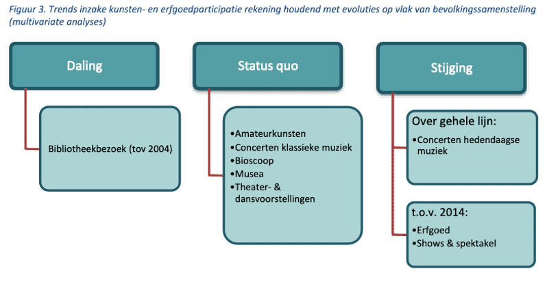 Meer gedetailleerde analyses tonen dat het verhoogde aandeel hoger opgeleiden in de totale bevolking in belangrijke mate heeft bijgedragen tot het status quo of de stijging van de participatiecijfers, en dat voor zowel de participatie aan kunsten en erfgoed. Omdat hoogopgeleiden een groter aandeel in onze samenleving vormen en zij ook meer participeren aan uithuizige cultuur, noteert het Kenniscentrum Cultuur- en MediaParticipatie hogere participatiegraden. De keerzijde daarvan is dat sociale ongelijkheden in cultuurparticipatie onverminderd blijven bestaan.