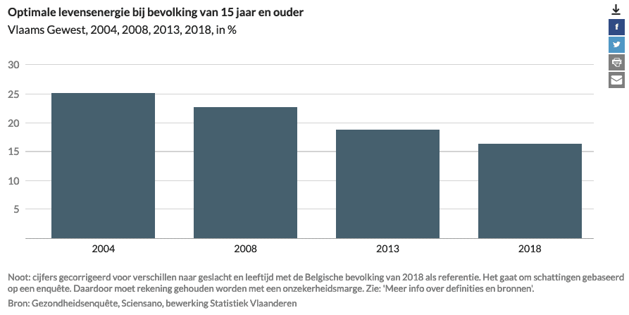 Ondanks onze tevredenheid met het leven lijken we aan levensenergie in te boeten. In 2018 had 1 op de 6 inwoners van het Vlaamse Gewest van 15 jaar en ouder een optimale levensenergie. Tussen 2004 en 2018 is dat percentage gedaald van 25% naar 17%.