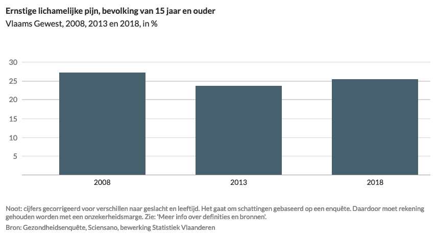 In 2018 gaf in het Vlaamse Gewest bijna 1 op de 4 personen van 15 jaar en ouder aan last te hebben van ernstige lichamelijke pijn. Het gaat om personen met matige, hevige en heel hevige lichamelijke pijn.