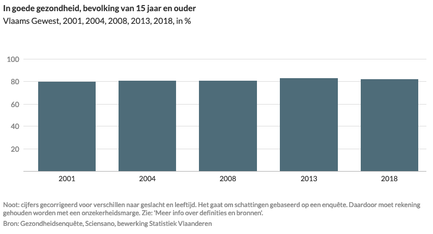 De gezondheidsenquête komt in 2018 uit bij 83% van de Vlamingen van 15 jaar en ouder die zijn/haar gezondheid zelf ‘goed’ of ‘zeer goed’ beoordeelt (subjectieve gezondheid). Dat percentage bleef in vergelijking met de voorgaande jaren vrij stabiel.