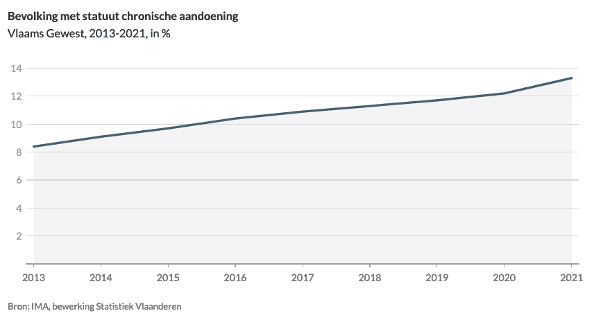 In 2021 had 13% van de bevolking in het Vlaamse Gewest in de ziekteverzekering het statuut van een persoon met een chronische aandoening. Dat aandeel neemt jaarlijks in geringe mate toe. Dat hangt voor een deel samen met de veroudering van de bevolking. De percentages lagen vooral in West-Vlaanderen en in Limburg hoger dan het Vlaamse gemiddelde.