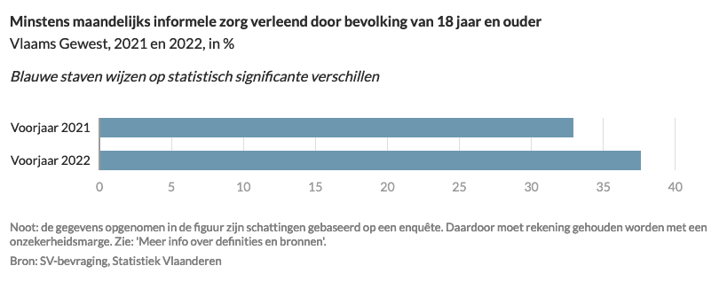 38% van de bevolking van 18 jaar en ouder gaf in het voorjaar van 2022 aan minstens maandelijks informele zorg te verlenen. Het gaat om hulp of zorg voor een ziek, gehandicapt of bejaard familielid, kennis of buur. Bij 33% van de bevolking gebeurde dat minstens 1 keer per jaar, maar minder dan maandelijks. In vergelijking met het voorjaar van 2021 is het aandeel van de bevolking dat minstens maandelijks informele zorg biedt toegenomen van 33% in 2021 tot 38% in 2022. Vergelijkbare cijfers over informele zorg voor de periode vóór 2021 zijn niet beschikbaar.