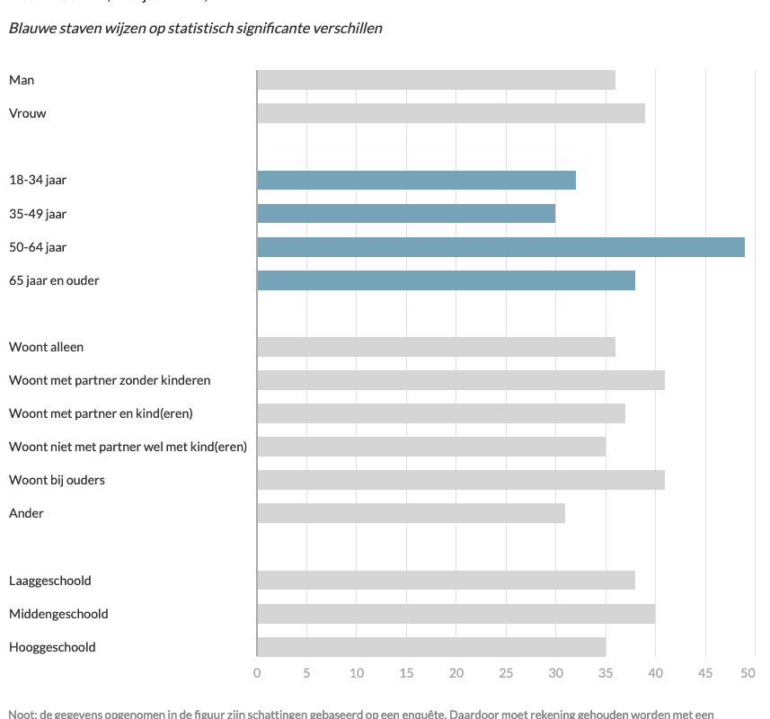 In de leeftijdsgroep van 50 tot 64 jaar nemen meer mensen informele zorg op (49%). 18 tot 49-jarigen nemen relatief minder zorg op zich.