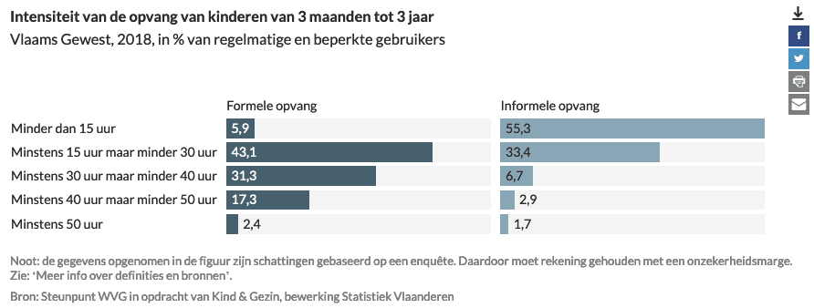 Kinderen die in formele voorzieningen (onthaalouders, kinderdagverblijven) opgevangen worden, verblijven er doorgaans langer dan kinderen die door het informele circuit (grootouders, andere familie, au pair …) opgevangen worden. In de formele opvang wordt de helft van de kinderen meer dan 30u per week opgevangen, in de informele opvang wordt ongeveer 10% meer dan 30u opgevangen.