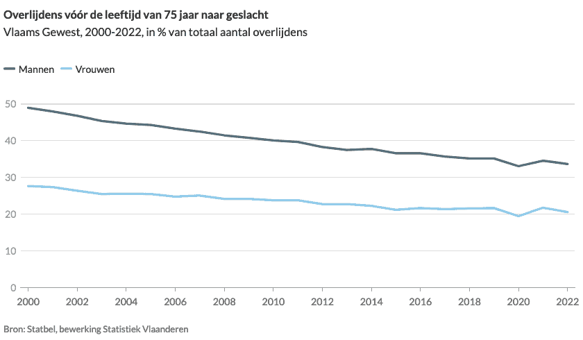 Vroegtijdige sterfte slaat op de overlijdens vóór de leeftijd van 75 jaar. In 2022 vonden 18.264 overlijdens plaats vóór de leeftijd van 75 jaar, wat neerkomt op 27% van het totaal aantal overlijdens. Bij mannen was dat 34%, bij vrouwen 21%. Daarmee lag het aandeel vroegtijdige sterfte in 2022 in lijn met de waargenomen evolutie uit het verleden. De figuur hieronder vertoont een kleine knik naar beneden in 2020. In dat jaar – met een hoog aantal overlijdens door de covidpandemie – lag het aandeel vroegtijdige sterfte in de totale sterfte nog wat lager dan verwacht volgens de evolutie: 33% van de overlijdens bij mannen en 20% van de overlijdens bij vrouwen vond in 2020 plaats vóór de leeftijd van 75 jaar.