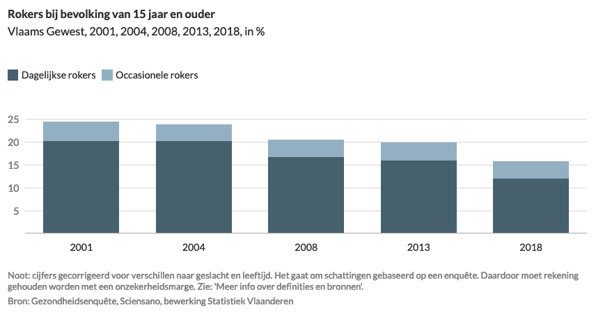 In 2018 rookte in het Vlaamse Gewest 16% van de personen van 15 jaar en ouder. 3 op de 4 rokers waren dagelijkse rokers. Het percentage dagelijkse rokers is sinds 2008 gedaald: in 2001 rookte 20% van de personen van 15 jaar en ouder dagelijks; in 2018 ging het om 12%. Het percentage occasionele rokers is sinds 2001 minder of meer stabiel gebleven.