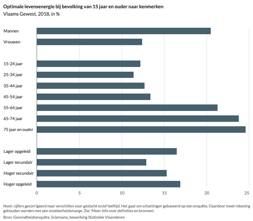 In het Vlaamse Gewest waren er in 2018 meer mannen dan vrouwen met een optimaal energieniveau. De optimale vitaliteit is lager bij de personen jonger dan 55 jaar dan bij personen van 55 jaar en ouder.