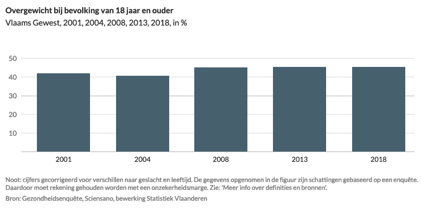 In 2018 had 45% van de volwassenen overgewicht. Het gaat om personen met een Body Mass Index van 25 of meer. Bij 15% ging het om zwaarlijvigheid. Dat percentage bleef de voorbije 10 jaar vrij stabiel.
