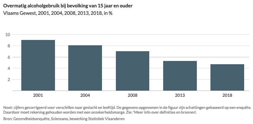 In 2018 gaf 79% van de Vlamingen van 15 jaar en ouder aan wel eens alcohol te hebben gedronken in de voorbije 12 maanden. De helft (52%) deed dat minstens wekelijks. Bij de bevolking van 15 jaar en ouder gebruikte in 2018 5% overmatig alcohol. Bij mannen betekent dat, volgens de geldende richtlijnen, meer dan 21 glazen alcohol per week, bij vrouwen meer dan 14 glazen per week. Het percentage Vlamingen dat overmatig alcohol drinkt, daalt langzaam. In 2001 bedroeg dat 9%.