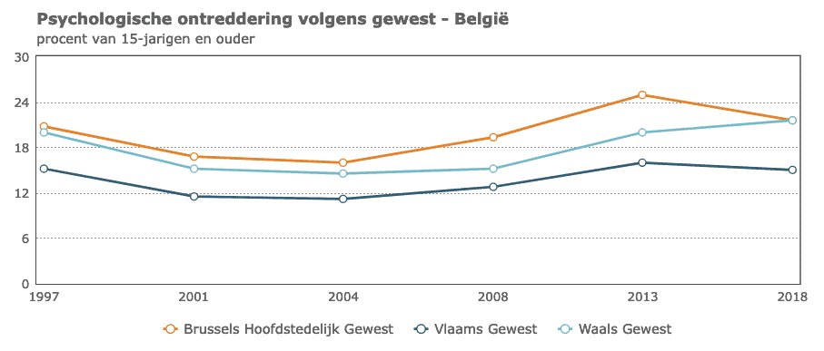 In 2018 bevond 17,9% van de Belgische bevolking van 15 jaar en ouder zich in een situatie van psychologische ontreddering. Om de duurzame-ontwikkelingsdoelstelling (SDG) tegen 2030 te realiseren, zal dat cijfer de komende jaren moeten dalen.