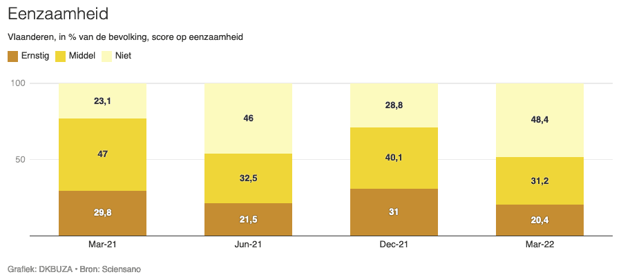 Bij de tweede bevraging in de zomer bleken de gevoelens van eenzaamheid over heel de lijn afgenomen te zijn. De grootste groep (46%) voelde geen eenzaamheid (meer). 21,5% van de bevolking kende niettemin wel nog ernstige gevoelens van eenzaamheid. Bij de vierde golf kantelden de verhoudingen weer. 31% van de Vlaamse bevolking kampte met ernstige gevoelens van eenzaamheid. Maar in maart 2022 liggen de verhoudingen over heel de lijn weer positiever. 48,4% van de Vlamingen kent geen gevoelens van eenzaamheid (meer).