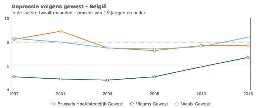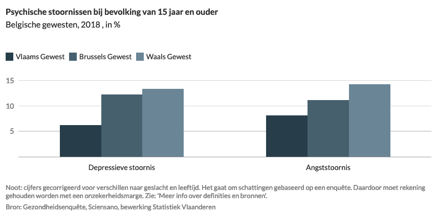 In 2018 had in het Vlaamse Gewest 6% van de personen van 15 jaar en ouder een depressieve stoornis en had 8% een angststoornis. Het Vlaamse Gewest telt verhoudingsgewijs minder inwoners met een depressieve stoornis of een angststoornis dan het Brusselse Hoofdstedelijke Gewest.