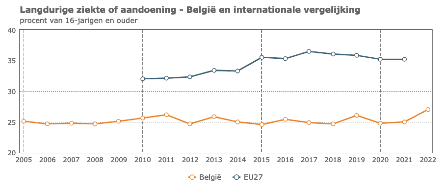 In 2022 verklaarde 27% van de Belgische bevolking van 16 jaar en ouder, een langdurige ziekte of aandoening te hebben. Om de duurzame ontwikkelingsdoelstelling tegen 2030 te realiseren, moet dat cijfer dalen.