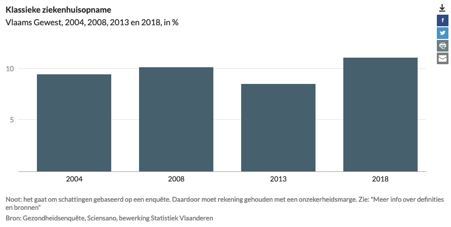 In 2018 had 11% van de inwoners van het Vlaamse Gewest in het afgelopen jaar een ziekenhuisopname of hospitalisatie achter de rug. Het gaat om een opname in een ziekenhuis met minstens 1 overnachting. Het aandeel personen dat gehospitaliseerd werd, steeg tussen 2013 en 2018, maar die stijging is statistisch niet significant.