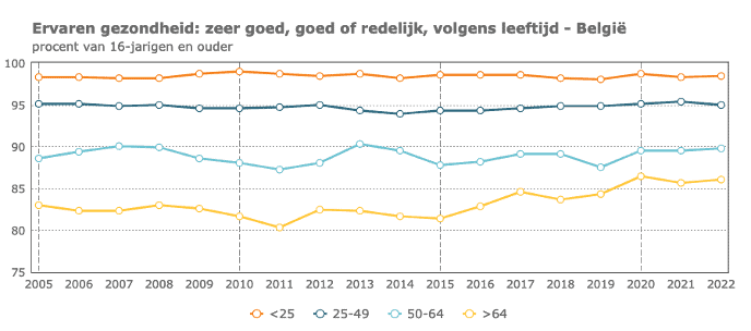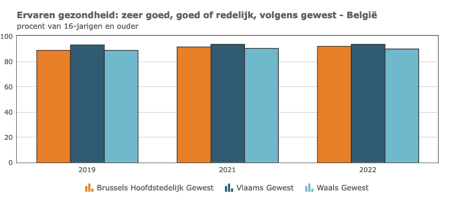 In 2022 verklaart 92% van de Belgische bevolking van 16 jaar en ouder zich in een zeer goede, goede of redelijke gezondheidstoestand te bevinden. Om de duurzame ontwikkelingsdoelstelling tegen 2030 te realiseren, moet dat cijfer stijgen.