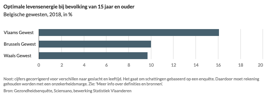 Het percentage inwoners met een optimale levensenergie lag in 2018 in het Vlaamse Gewest hoger dan in het Brussels Hoofdstedelijk Gewest. In het Vlaamse Gewest ging het om 17% van de bevolking van 15 jaar en ouder. In het Brussels Hoofdstedelijk Gewest lag dat aandeel op 10%.