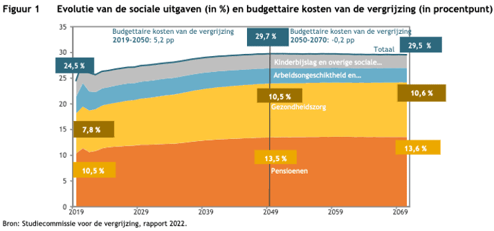 Alle sociale overheidsuitgaven (naast uitgaven voor de gezondheidszorg, ook de uitgaven voor pensioenen, kinderbijslag en arbeidsongeschiktheid) zouden op lange termijn (2070) bijna 30% uitmaken van het bbp in België.
