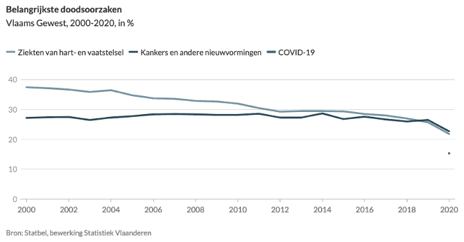 Bijna de helft van alle overlijdens in 2020 in het Vlaamse Gewest kon worden toegeschreven aan twee groepen van doodsoorzaken: kanker (of andere nieuwvormingen) (23%) en ziekten van het hart- of vaatstelstel (22%). Het effectief aantal overlijdens aan kanker en ziekten aan hart- of vaatstelsel nam tussen 2019 en 2020 wel af. In 2020 ging het om 16.133 overlijdens aan kanker (-428 tegenover 2019) en 15.481 overlijdens aan ziekten aan hart- of vaatstelsel (-586 tegenover 2019). Tegelijk stierven in 2020 10.842 personen aan de gevolgen van een Covid-19-besmetting. Dat is 15% van het totaal aantal overlijdens.