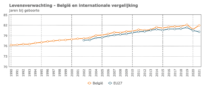 De levensverwachting neemt toe, meer mensen worden ouder. In 2021 bedroeg de levensverwachting bij de geboorte in België 81,9 jaar.