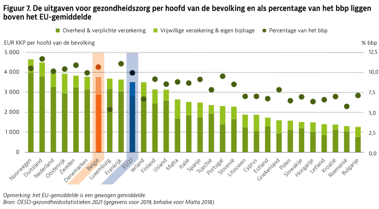 Volgens berekeningen van de OESO besteedde België 10,7% van het bbp aan gezondheidszorg, dat is een groter aandeel dan het EU-gemiddelde (9,9%). In 2019 bedroegen de uitgaven voor gezondheidszorg 3.773 euro per hoofd van de bevolking, wat iets hoger is dan het EU-gemiddelde (3.523 euro).