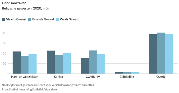 In het Vlaamse Gewest waren er in 2020 relatief gezien iets meer overlijdens door een hart- of vaatziekte dan in de 2 andere gewesten. Dat geldt ook voor overlijdens door kanker. In het Brusselse Gewest lag het aandeel overlijdens door een Covid-19-besmetting het hoogst.