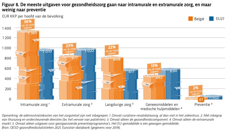 De meeste uitgaven voor gezondheidszorg in België gingen naar intramurale zorg, in 2019 goed voor meer dan 36% van alle uitgaven voor gezondheidszorg. Dat is hoger dan het EU-gemiddelde van 29%). Bijna een kwart van de uitgaven voor gezondheidszorg werd uitgegeven aan extramurale zorg. De uitgaven voor langdurige zorg lagen aanzienlijk hoger dan in de EU en omvatten meer dan een vijfde van alle uitgaven voor gezondheidszorg. 1/8 van de uitgaven voor gezondheidszorg ging naar geneesmiddelen en medische hulpmiddelen die buiten ziekenhuizen worden gebruikt. Uitgaven voor preventie bedroegen slechts 1,6% van alle uitgaven voor gezondheidszorg, een lager aandeel dan het EU-gemiddelde van 2,9%.