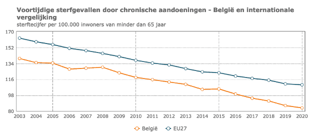 In 2020 waren er in België bij de min-65-jarigen 83,5 sterfgevallen door chronische aandoeningen per 100.000 inwoners van die leeftijdsgroep. Om de duurzame ontwikkelingsdoelstelling tegen 2030 te realiseren, moet dat cijfer dalen naar 70,1 per 100.000 inwoners. Als de trend sinds 2003 zich doorzet, zullen we dat doel bereiken.