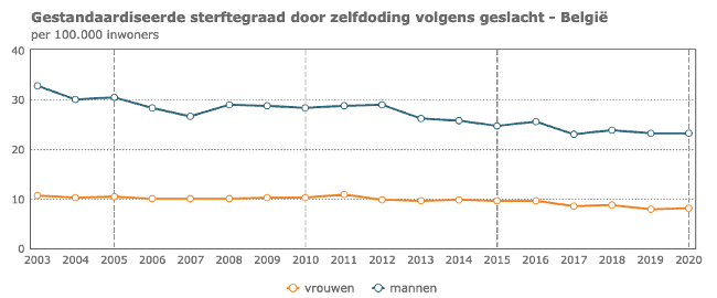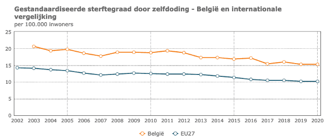 In 2020 bedroeg de sterftegraad door zelfdoding in België 15,2 per 100.000 inwoners. Om de duurzame ontwikkelingsdoelstelling tegen 2030 te realiseren, moet dat cijfer dalen. Dat is tussen 2003 en 2020 alvast het geval.
