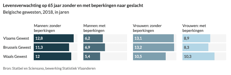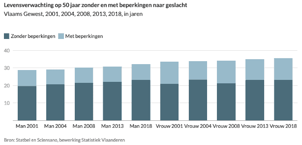Op basis van gegevens van 2018 wordt geschat dat in het Vlaamse Gewest mannen van 50 jaar nog een levensverwachting hebben van gemiddeld 32 jaar, 23 jaar daarvan zonder beperkingen in het dagelijkse leven en 9 jaar met beperkingen. Vrouwen van 50 jaar hebben een vooruitzicht van gemiddeld genomen nog 36 jaar: 23,1 jaar zonder beperkingen en 12,5 jaar met beperkingen in het dagelijkse functioneren.