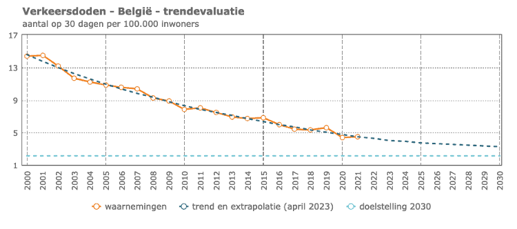 In 2021 vielen er in België per 100.000 inwoners 4,5 verkeersdoden binnen de dertig dagen na een ongeval. Om de duurzame ontwikkelingsdoelstelling tegen 2030 te realiseren, moet het aantal verkeersdoden gehalveerd worden. Met een voortzetting van de trend sinds 2000 zullen we die duurzame ontwikkelingsdoelstelling tegen 2030 niet realiseren.