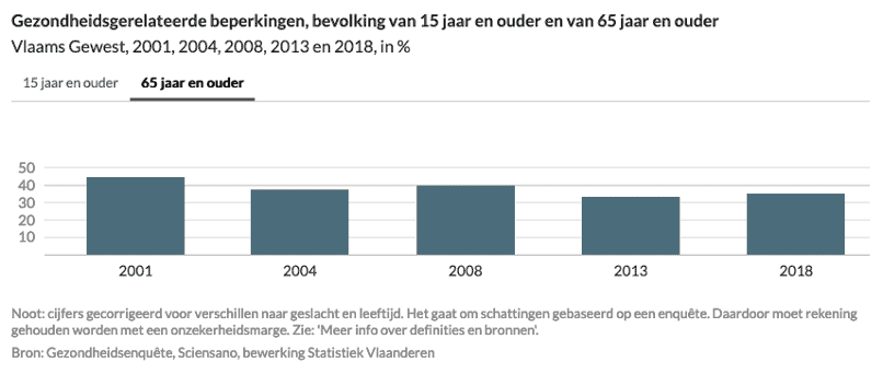 1 op 3 Vlamingen van 65 jaar en ouder gaf in 2018 aan door gezondheidsproblemen beperkt te zijn geweest in dagelijkse activiteiten, terwijl 1 op 5 Vlamingen van 15 jaar en ouder dat aangaf.