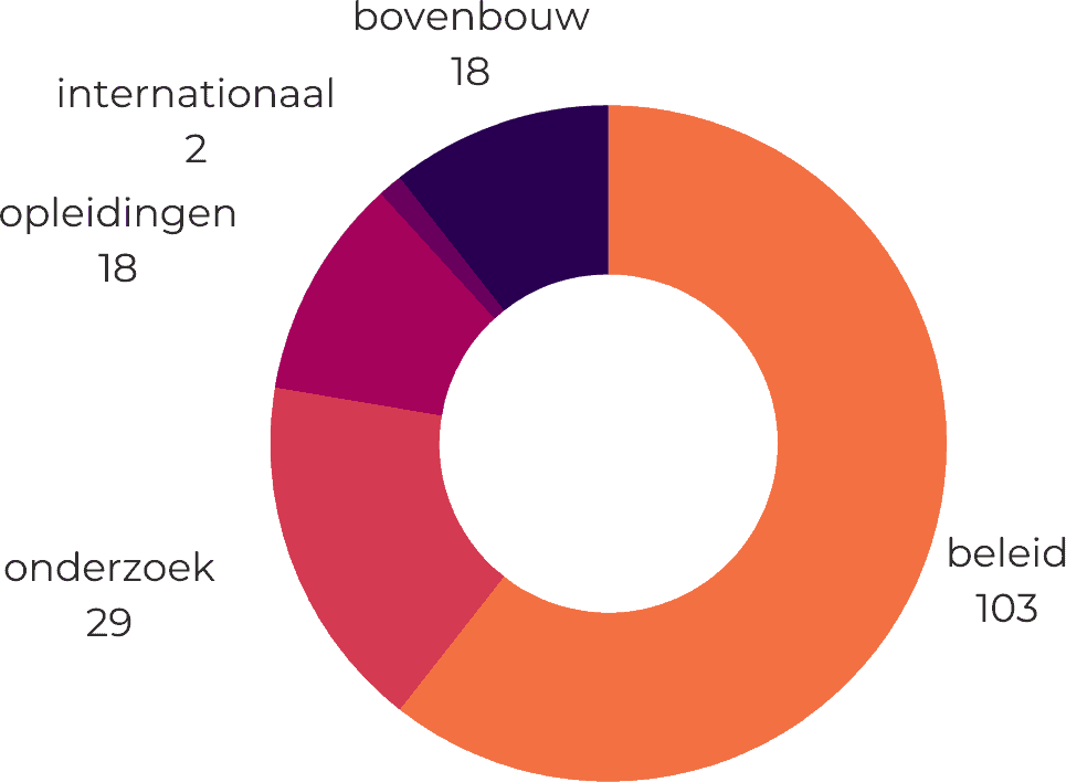 In het totaal namen we deel aan 170 overlegmomenten met 49 verschillende actoren. 60% daarvan gaat uit naar overleg met beleidsactoren.