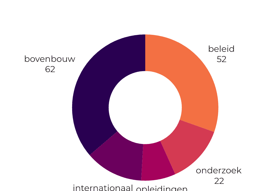 In het totaal namen we deel aan 171 overlegmomenten met 70 verschillende actoren. Het grootste deel (66%) daarvan gaat naar overleg met beleidsactoren en partners in de bovenbouw.