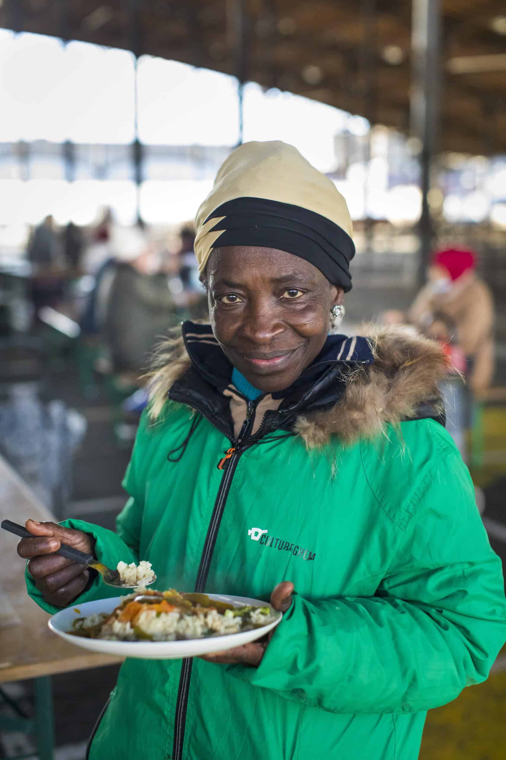 Een koude maar zonnige maandagmiddag aan de markthallen Abattoir in Anderlecht. Etenstijd! Heerlijke geuren komen je tegemoet. Dampende soep in reuzengrote ketels, rijst met kleurrijke groenten en bananenbeignets in de aanbieding. Voor ieder wat wils. Geen vragen, geen registratie. Een vrije bijdrage mag, maar hoeft niet. Samen eten, delen, babbelen. Aan lange tafels, in groepen of alleen. Een klasgroep uit de buurt geniet vrolijk en joelend van wat ze zelf hebben klaargemaakt. Samen koken verbindt.