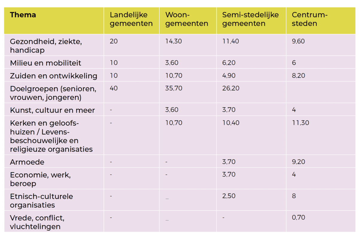 De thema’s waarvoor lokale middenveldspelers zich inzetten, hangen samen met de graad van verstedelijking. Naarmate die toeneemt, zien we een grotere gelaagdheid in de thema’s en komen relatief meer kwesties aan bod die gerelateerd zijn aan bijvoorbeeld armoede, etnisch-culturele diversiteit en vluchtelingen.