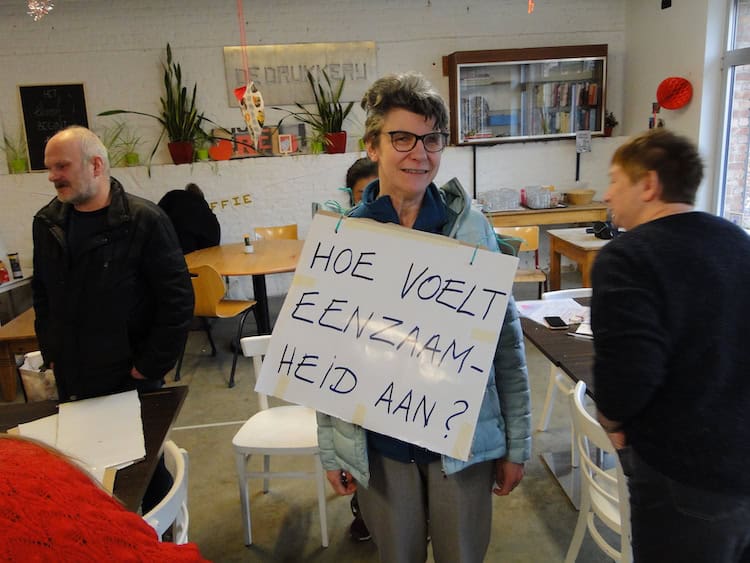 Ook deze dag was er een groepje dat samen aan de slag ging in de keuken en een giga ketel soep op tafel zette. Het lokaal zat ‘s middags goed vol, het was voor sommigen zelfs zoeken naar een plaatsje. “Tegenwoordig is er vaak zoveel volk”, hoorde ik iemand zeggen. Een spontane reactie van iemand anders: “Het eten is hier dan ook zo lekker!” Als ik aanschuif voor mijn kommetje soep, vallen mijn ogen op een blad dat ophangt met daarop de woorden “Liefde is… samen eten (in De RuimteVaart)”. En die liefde kon je zeker voelen. Of het nu was voor de soep, het niet alleen moeten zijn of voor elkaar.