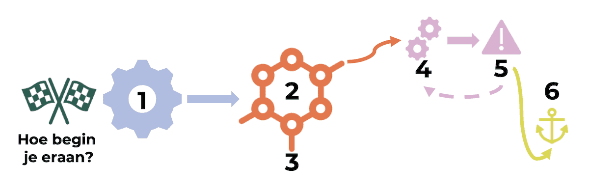 Het traject groeit mee met jouw organisatie. In het begin kan het snel gaan. Fase 1 en 2 kun je combineren tijdens één denkdag met je team. Daarna worden de oefeningen meer complex en uitgebreid.