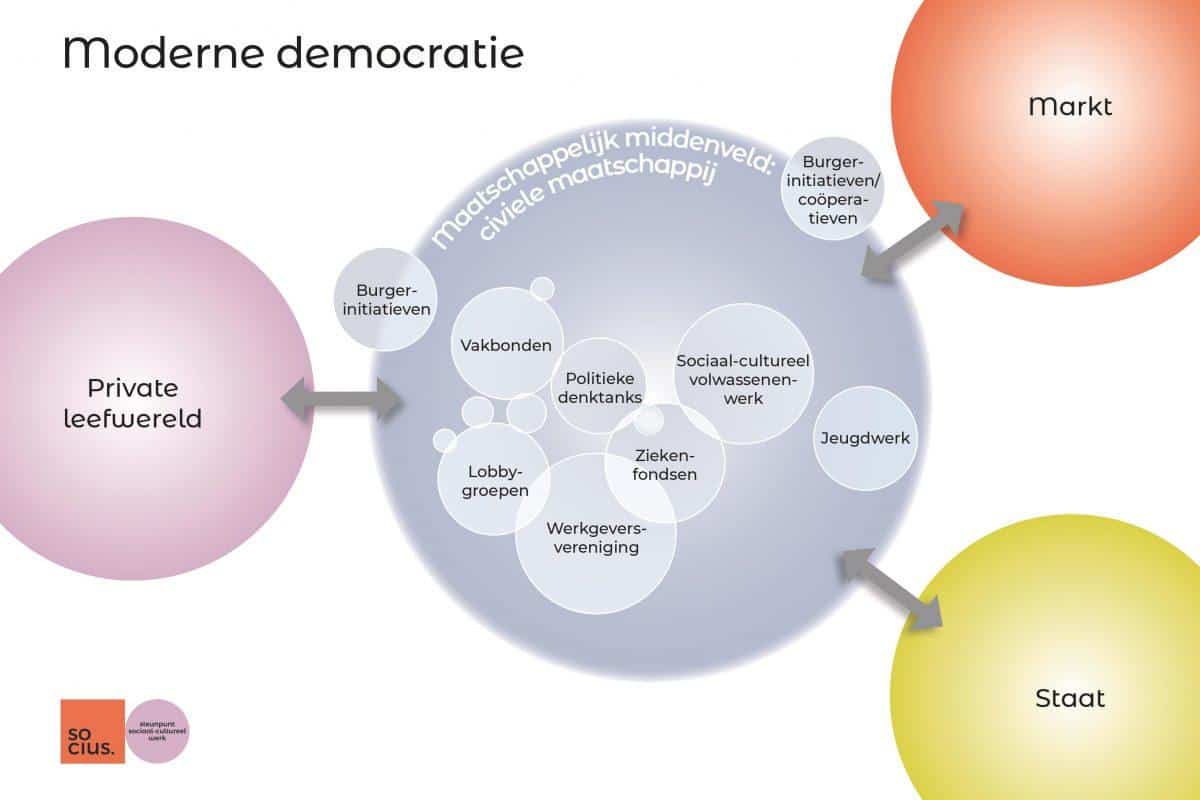 Sociaal-culturele praktijken spelen zich doorgaans af in dat maatschappelijk middenveld. Sociaal-culturele organisaties zijn civiele actoren die persoonlijke kwesties of maatschappelijke ambities uit de leefwereld van mensen tot een publieke zaak maken in de civiele samenleving. Zo proberen ze markt of staat in een bepaalde richting te bewegen. Daarom zeggen we wel eens dat sociaal-culturele praktijken plaatsvinden op de ‘naad tussen systeem en leefwereld’. Dat is de politieke en democratische dimensie van de civiele samenleving.