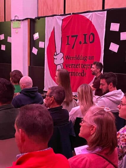 Op de vooravond van de Werelddag van Verzet tegen Armoede kwamen in Dendermonde een 50-tal burgers samen, zowel mensen met als zonder armoede-ervaring. Ze bekeken een podcast met armoede-expert Wim Van Lancker en namen deel aan een interactieve sessie door Katrien Voorpoels, met vragen over de arbeidsmarkt, sociale risico’s en ideologische drijfveren.
